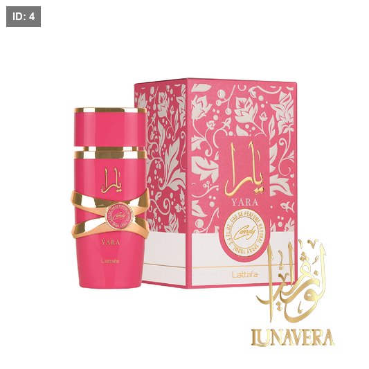 Yara Candy by Lattafa is an elegant women's fragrance that combines refreshing fruity notes and sweet floral scents with a warm touch of vanilla, giving you a feeling of femininity and distinction. The fragrance opens with vibrant notes of green mandarin and blackcurrant, then moves to a rich heart of sparkling strawberry and gardenia blossoms, finally settling into a deep base of vanilla, sandalwood, musk, and amber in a balanced composition that lasts all day.